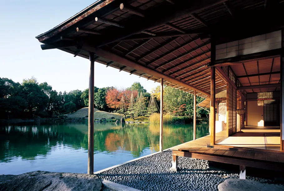 養浩館庭園は、数寄屋造りの屋敷をそなえる回遊式林泉庭園。透き通る水面と、四季ごとに表情を変える庭木が調和した、気品あふれる名園です。